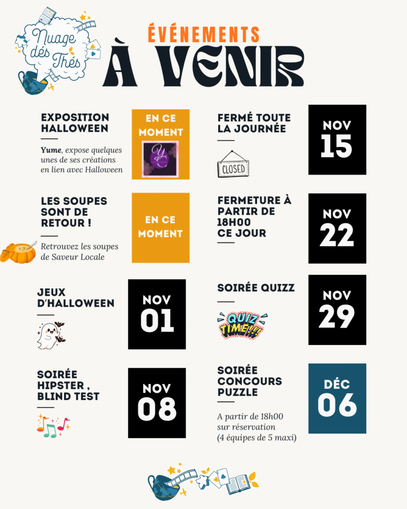 Le samedi, notre café se transforme en un lieu vibrant et animé. Rejoignez-nous pour une expérience divertissante, avec des tournois, quizz, activités spéciales et une énergie contagieuse.